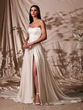 A romantic A-line gown with a thigh-high slit, scooped neckline, asymmetrical pleats, and delicately beaded lace on the bodice. Optional bow available. Ivory only.